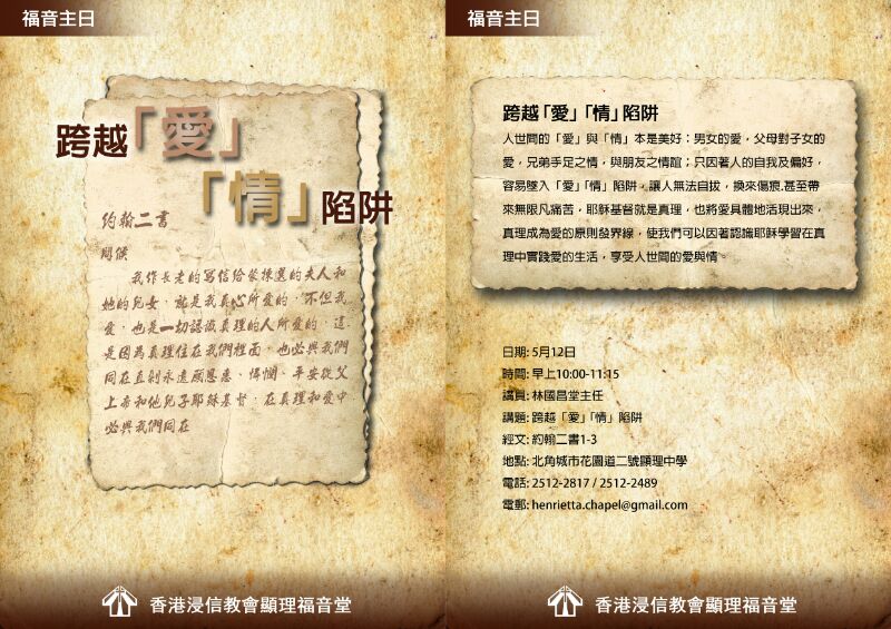 時間: 早上10:00-11:15 講員: 林國昌堂主任 講題: 跨越「愛」「情」陷阱 經文: 約翰二書1-3 地點: 北角城市花園道二號顯理中學 電話: 2512-2817 / 2512-2489 電郵: henrietta.chapel@gmail.com