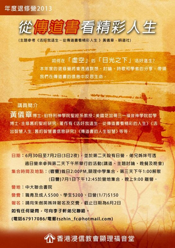 營會基本資料 日期:6月30日-7月2日(3日2夜) 地點:新界沙田香港中文大學聯合書院湯若望宿舍 營位:30人(宿營) 營費:職青成人$500 主題:「活好我這生」 目的:透過《傳道書》的內容反思生命